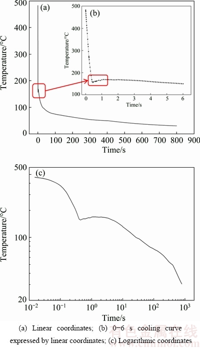 Figure 7(c) shows the same cooling curve at center point of the quenching surface expressed by logarithmic coordinates. By comparing Figs. 7(a), (b) and (c), it can be found that the slight temperature fluctuation in Figs. 7(a) and (b) is consistent with the approximate temperature plateau in Fig. 7(c). The temperature plateau appears at 160-170 °C and lasts about 3 s. XIONG et al [34] also found temperature fluctuations in temperature range of 90-140 °C at the cooling curves on the quenching surface of the 7050 alloy which were calculated by two different mathematical models. In addition, BUCZEK and TELEJKO [35] observed temperature fluctuations in measured cooling curves at locations of 1.1-4.5 mm from the quenching surface when the brass probes were immersion quenched. For instance, the temperature fluctuation appeared in temperature range of 260-290 °C and its amplitude was 30 °C at 1.1 mm from the quenching surface. They thought that the main reason for this temperature fluctuation was the formation and subsequent rupture of steam films on the quenching surface in the initial stage of quenching.