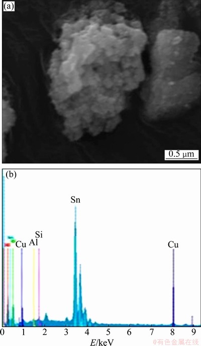The SEM micrograph and EDX spectrum of the heat-treated SnO2 sample at 700 °C is shown in Fig. 4. It shows an aggregate of very fine particles that cannot be virtually distinguished or measured using a SEM. The chemical composition measured by EDX is almost Sn and very small quantity of Cu, Si and Al, which is consistent with the XRF result.