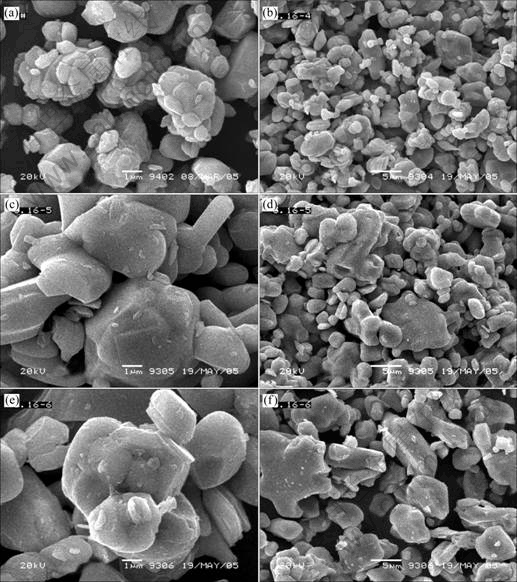 Fig.3 SEM micrographs of LiCoO2 synthesized at different molar ratios of Li to Co: (a)-(b) 1.0; (c)-(d) 1.03; (e)-(f) 1.05