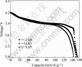 Fig.5 Discharge curve of LiCoO2 synthesized at different molar ratios of Li to Co of 1.0, 1.03, 1.05 respectively