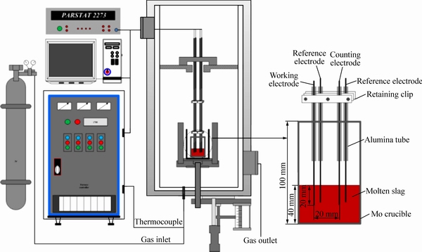 随着钛工业的日益发展,高品位天然金红石资源日趋枯竭,采用电炉冶炼钛铁矿已成为目前制备高钛渣的主流工艺[1-2]。电导率是炉渣最重要的高温物化特性之一,其大小由炉渣的组成、温度和气氛等因素决定。在电炉冶炼时,熔渣导电性直接影响电炉供热制度,熔池温度分布以及冶炼过程的综合能耗。此外通过熔渣导电性的研究,也有助于理解炉渣导电机理和结构变化。