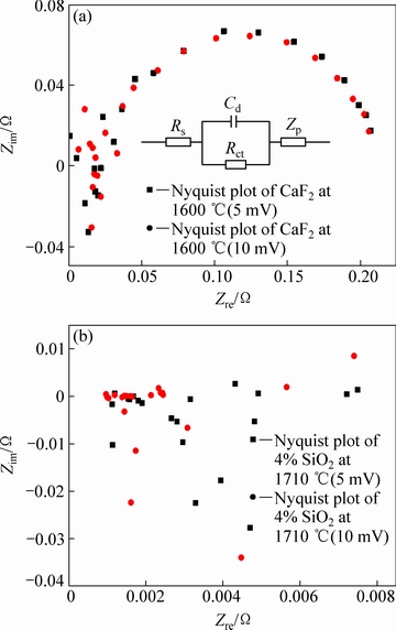 Fig. 2 Nyquist diagrams of CaF2 at 1600 ℃ (a) and TiO2-FeO-4%SiO2 melt at 1710 ℃ (b) with 5 mV and 10 mV excitation voltage, respectively