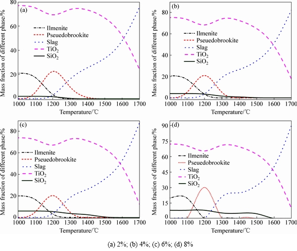 图4 不同SiO2含量的TiO2-FeO-SiO2三元钛渣物相理论计算