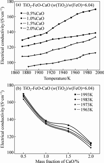 2) TiO2-FeO-X(SiO2,CaO,MgO)三元钛渣的导电性同时受电子-离子两种导电机制的影响,高温时钛渣熔融状态,主要是由于电子导电,随温度的降低,TiO2晶格中氧空位浓度减少,电子导电的影响逐渐减弱。