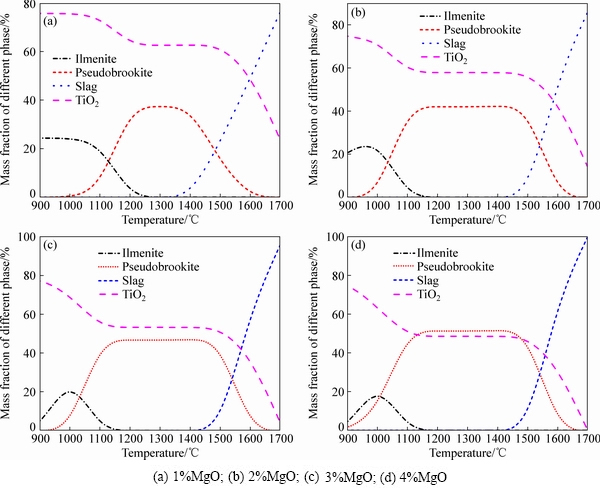 本文作者对TiO2-FeO-MgO三元钛渣随温度变化的物相变化进行了理论计算,结果如图8所示。从图8中可知,随着温度从1700 ℃降低到1500 ℃过程中,液相中有TiO2和假板钛矿晶体开始慢慢析出,钛铁矿含量不断增多。当MgO含量从1%增加到4%过程中,钛铁矿的析出温度分别为1250、1200、1175、1150 ℃,这表明MgO的添加可降低钛铁矿晶体的析出温度。本文作者曾对相同成分的TiO2-FeO-MgO三元随炉冷却的渣样进行了X射线衍射物相检测[20],结果显示,不同MgO含量TiO2-FeO-MgO三元钛渣X射线衍射图谱趋势类似,主要物相为金红石(TiO2)和铁镁板钛矿((Fe Mg)xTiyO5)。XRD结果与理论计算结果基本吻合。