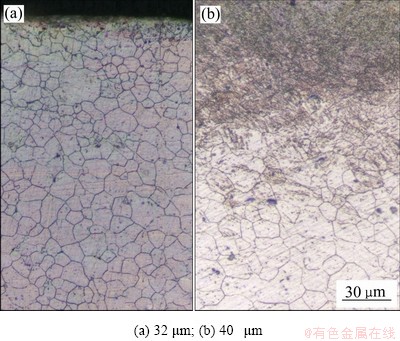 不同的工作振幅,对试样的晶粒细化程度不同,图12给出了工作振幅分别为32 μm和40 μm的USP处理下的试样金相显微组织图。从图12(b)可观察到喷丸处理的表层晶粒出现了孪晶组织,晶粒细小,而心部中心组织晶粒相对粗大,晶粒由表层向心部晶粒尺寸逐渐变大。试样在振幅为32 μm的喷丸处理下,晶粒平均尺寸约为8.16 μm,而当工作振幅调至40 μm时,晶粒平均尺寸更小,减小至8.00 μm,比喷丸前的晶粒平均尺寸减小了39.53%。当工作振幅增大时,工具头的振动平均速度增大,钢球跟随工具头以更大的速度来回振动,钢球的动能随之增大,撞击试样表面产生更大的塑性变形,进而使受钢球撞击的晶粒影响层和表面晶粒细化层变厚,实现表层晶粒逐渐细化,而试样心部组织受喷丸影响较小,晶粒较之表层更加粗大。