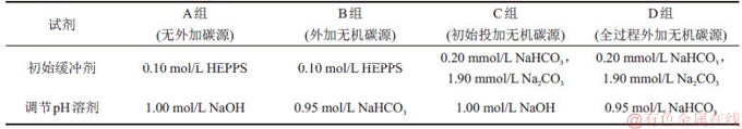 )和有机碳的竞争利用规律,在模拟水质基础上分别采用NaHCO3和Na2CO3组合以及4-羟乙基哌嗪丙磺酸(HEPPS)作为模拟废水的pH缓冲剂,分别设置4个实验组(见表2),以对比不同实验组中初始的无机碳浓度,同时避免小球藻培养过程中为调节pH而投加无机碳源对小球藻生长的影响。其中HEPPS作为一种生物缓冲剂,对细胞无毒性作用,且不能够被细胞利用,故可以作为缓冲剂而不会增加培养液中的有机碳浓度。