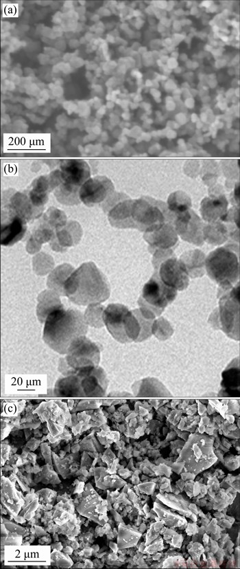 Figure 1 (a) SEM image of 40 nm SiC; (b) TEM image of 40 nm SiC; (c) SEM image of 500 nm SiC