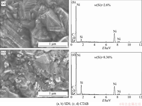 The surface morphology of nickel-silicon carbide deposits created with 40 nm silicon carbide is showed in Figure 3. It can be seen that better dispersion is achieved using SDS as a surfactant than using CTAB. CTAB increased the number of 40 nm silicon carbide nanoparticles in the nickel-silicon carbide plating, but it has poor uniformity due to agglomeration. The EDS spectra in Figures 3(b) and (d) also show that more 40 nm silicon carbide nanoparticles are present in the nickel-silicon carbide plating when CTAB is contained in the electrolyte. This is the reason that cations ionized from CTAB attaching to the surface of silicon carbide particles make it easier for them to move to the cathode surface under an applied electric field and promotes the co-deposition of nickel and silicon carbide. Cationic surfactant CTAB is beneficial to increase the suspension property of SiC particles. Then CTAB surfactant adsorbs more silicon carbide nanoparticles and reduces the active surface area. This agrees with the lower deposition current observed in the cyclic voltammograms. Surface morphology and element distribution diagrams of Ni-SiC (40 nm SiC) deposits are shown in Figure 4.