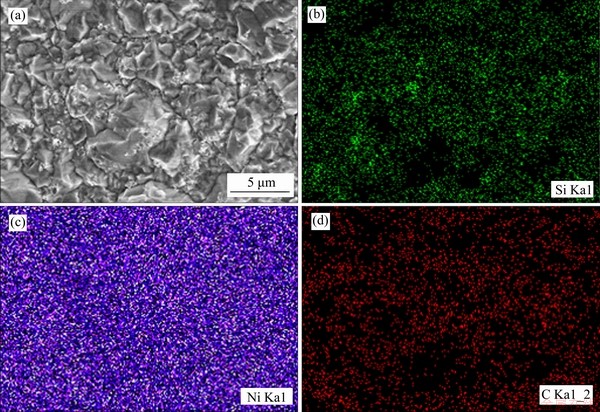 Figure 4 Surface morphology and element distribution diagrams of Ni-SiC (40 nm SiC) deposits