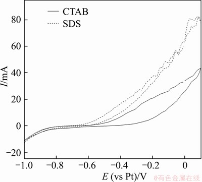 Figure 5 Cyclic voltametry curves of Ni-SiC (500 nm SiC) electrolytes containing SDS and CTAB