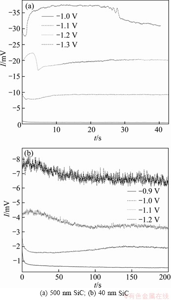 When subjected to various forces such as static electricity, intermolecular force and chemical adsorption in an electrolyte, any silicon carbide particles remaining stable on the cathode surface will increase the irregularity of its surface. These irregularities can provide a substrate for the heterogeneous nucleation of nickel, thereby reducing its nucleation potential. The potentiostatic curves for the nucleation and growth of nickel-silicon carbide by electrodeposition in an electrolyte containing SDS are presented in Figure 7. The potential applied was -1.0, -1.1, -1.2 and -1.3 V for the electrolyte containing 500 nm silicon carbide (Figure 7(a)), but this was changed to -0.9, -1.0, -1.1 and -1.2 V for the 40 nm silicon carbide (Figures 7(b)). During each constant potential step, the current first increases and then decreases due to the charge of the electric double layer. The current then gradually rises again to a maximum due to nucleation and growth of a new phase. Soon after this, the current gradually decreases again. Thus, the nature of the electrode surface is controlled by diffusion.