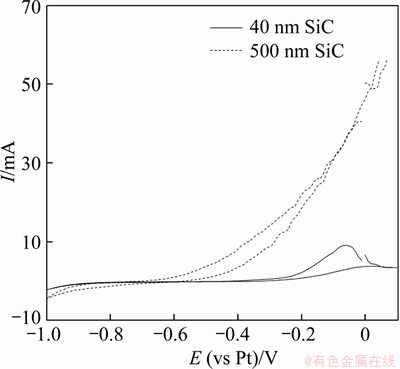 Figure 9 shows the cyclic voltammetry curves of the electrodeposition of nickel-silicon carbide coating in the electrolyte with CTAB. The sizes of silicon carbide particles are 40 and 500 nm, respectively.