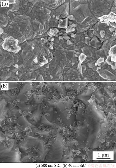 Nickel-silicon carbide composite coatings were prepared using a modified Watts bath containing SiC particles in the electrolyte. The bath composition and the deposition parameters are shown in Table 1. For this study, the mean diameter of silicon carbide particles is 40 or 500 nm. The silicon carbide particles were gray-black powder, which was prone to agglomeration. Surface morphologies of SiC with different mean diameters are shown in Figure 1. As shown in Figure 1, the 40 nm silicon carbide particles were round, evenly distributed and uniform in size, but also exhibited a greater tendency for agglomeration. The 500 nm SiC particles exhibited irregular shapes and different particle sizes. Each bath was added surfactant either sodium dodecyl sulfate (SDS) 4-7 g or cetyltrimethy ammonium bromide (CTAB) 0.3-0.6 g. To disperse silicon carbide particles uniformly and suspend it in the bath, the electrolyte containing silicon carbide was ultrasonically dispersed for 30 min and then stirred with a magnetic stirrer for 2 h prior to electrodeposition. The anode was a pure nickel plate. The cathode was copper plate sealed with insulated tapes to leave a 10 mm×10 mm exposed area. The electrodes were polished with SiC abrasive papers of different grit sizes, and then ultrasonically cleaned in the distilled water for 5 min before plating. The electrodes were immersed vertically in the bath and the distance between them was 25 mm. Electroplating of nickel-silicon carbide onto a 1 cm2 Cu disk was then conducted at a temperature of about 40 °C and pH=4. A current density 30 mA/cm2 was applied for 75 min. During electrodeposition, the bath was agitated using magnetic stirrer to assist with silicon carbide deposition.