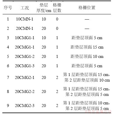 为探讨刚性基础下不同工况土工格栅加筋垫层的工作性状,共进行了9个模型静载试验,模型试验工况如表1所示。