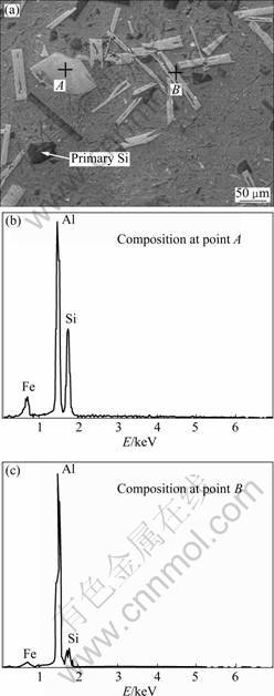 Fig.5 Composition analysis of constituent phases of Al-18%Si-5%Fe alloy: (a) SEM image; (b) Composition of point A; (c) Composition of point B