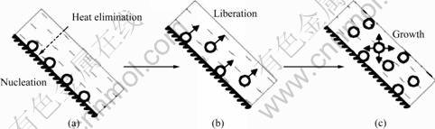 Fig.7 Schematic diagram of crystallization rain: (a) Nucleation; (b) Nuclei moving freely and dispersing into melt-nucleus moving; (c) Grain growth