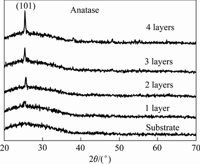 图1所示为采用水溶性壳聚糖含量为0.04%(质量分数)的溶胶,涂膜1~4次,在550 ℃下煅烧1 h制得的薄膜及其基底的XRD谱。由图1可见,在2θ为25.1°处出现特征衍射峰,归属于TiO2的锐钛矿晶型(101)晶面的衍射峰。未观察到Er物种的衍射峰,这可能是Er分散均匀,也可能是铒以Er3+形式存在于TiO2晶格中,而不是以Er2O3晶体的形式独立析出[19]。EDX检测数据显示Er元素在膜层中的含量为1.0%(摩尔分数)。涂膜3层以下的衍射峰十分微弱,说明载体上承载的催化剂很少。涂膜层数从一层增加到4层,衍射峰强度依次增强,说明薄膜中Er-TiO2含量逐渐增多。