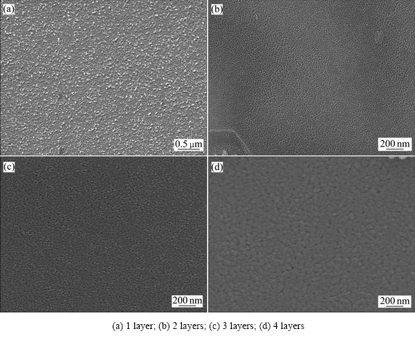 图2所示为涂膜次数不同所得薄膜的SEM像。由图2可看出,涂膜为一层时,薄膜表面TiO2颗粒大小不均一,不连续,当涂膜增加为两层时,薄膜连续性提高,颗粒排列较为紧密,颗粒粒径均匀化;涂膜增加到3层,膜层连续、完备,颗粒没有明显增大;继续增加涂膜到4层时,颗粒尺寸增大。