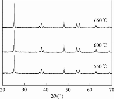 由于载体上的催化剂较少,为了更清晰地观察其晶体结构,收集与制膜相同条件制备的粉末做XRD表征。图5所示为水溶性壳聚糖含量为0.04%(质量分数)的溶胶,不同温度下经1 h煅烧制得的Er-TiO2粉末的XRD谱。从图5中可以看出,当煅烧温度从550 ℃升高到650 ℃时,样品只出现锐钛矿的衍射峰,且随着温度的升高,样品的衍射峰逐渐增强,表明晶体的结晶度逐渐提高。根据谢乐公式计算得粒子尺寸分别为9.2 nm、13.1 nm、15.8 nm,粒径增大。