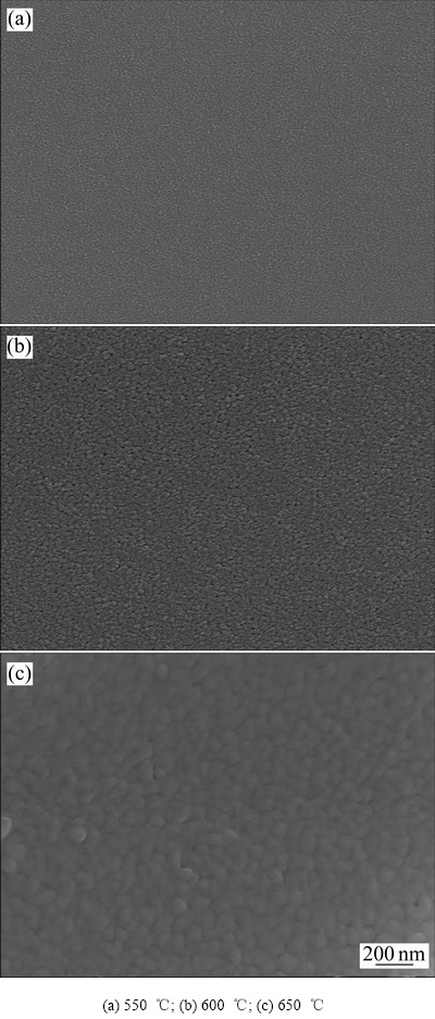图6所示为在不同煅烧温度下煅烧1 h制得的薄膜的SEM像。由图6可看出,当煅烧温度为550 ℃时,薄膜表面连续且平整,颗粒细小、均匀,孔径较小,孔隙率较高;当煅烧温度升高到600 ℃时,粒径增大,孔径增大,孔隙率降低。继续提高煅烧温度,颗粒粒径迅速增大,孔径进一步增大,孔隙率降低。