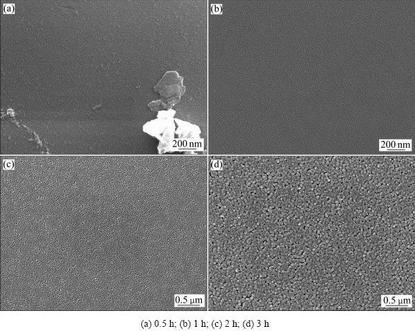 图9所示为不同煅烧时间下薄膜的SEM像。从图9中可知,当煅烧时间为0.5 h时,膜层晶粒均匀性较差。延长煅烧时间至1 h,膜层中晶粒细小,均匀。继续增加煅烧时间,颗粒粒径明显增大,孔隙率降低。