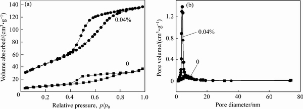 图13 水溶性壳聚糖含量为0和0.04%溶胶制得的Er-TiO2催化剂的N2吸附-脱附等温线图及孔径分布图