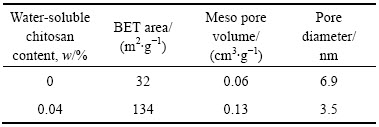 样品的N2吸附-脱附等温线及孔径分布如图13所示,溶胶中含有0.04% 水溶性壳聚糖制得样品与不含水溶性壳聚糖制得样品的吸附等温线均属于Ⅳ型, P/P0为0.4~1.0时,有典型的滞后环,表明该材料具有介孔孔道。与不添加添加剂相比(3~12 nm),添加水溶性壳聚糖(0.04%)使膜材料(3~6 nm)孔径变小,且孔径分布较窄;两个催化剂的结构参数见表1,添加水溶性壳聚糖样品的BET比表面积为143 m2/g,介孔孔容为0.13 cm3/g,显著大于没有添加剂的溶胶制备的样品(32 m2/g和0.06 cm3/g),亦大于以Span80为添加剂制备的样品的比表面积(99 m2g-1)和介孔孔容(0.1 cm3/g)[20]。