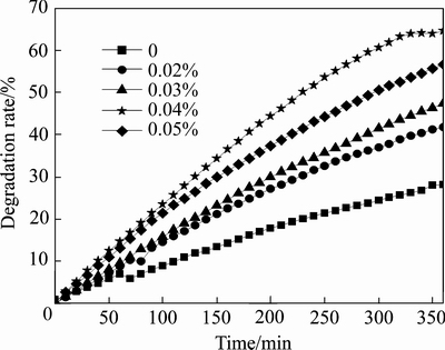 图14所示为水溶性壳聚糖含量分别为0、0.02%、0.03%、0.04%和0.05%的溶胶制备的薄膜的光催化降解率随时间的变化。由图14可知,6 h的光催化降解率依次为38.2%、41.8%、47.4%、64.6%、56.7%。当水溶性壳聚糖添加量为0.04%时,薄膜的光催化降解率最高为64.6%。本课题组以Span80为添加剂制备的多孔Er-TiO2薄膜,与本研究相同的实验条件:膜面积254 mm2,模拟可见光为光源,30 mL浓度为7.8 mg/L的甲基橙溶液,6 h的光催化反应,甲基橙的降解率为55.23%[20]。WANG等[18]制备致密Er-TiO2薄膜,膜面积为1935 mm2×5,紫外光为光源,250 mL浓度为8 mg/L的甲基橙溶液,1 h的光催化反应,甲基橙的降解率为22.65%。本研究光催化反应进行1 h时,甲基橙的降解率为14.7%。由此可见,以水溶性壳聚糖为添加剂制备的多孔Er-TiO2薄膜具有较高的光催化活性。这是由于水溶性壳聚糖为添加剂,可使催化剂颗粒尺寸达到8.2 nm,产生量子尺寸效应,光生电子和空穴的扩散速度提高,氧化还原能力增强。此外,TiO2粒径减小,使催化膜的比表面积增大,活性位点增多。