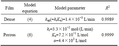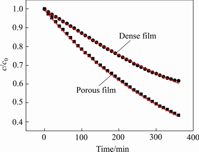 薄膜光催化降解甲基橙的动力学模拟结果如图15所示,模拟公式及参数见表2。不含添加剂的致密薄膜光催化降解率随时间的动力学模拟结果符合式(4),说明反应物在催化剂上的吸附很微弱;而多孔结构的薄膜光催化降解率随时间的动力学模拟结果符合式(6)说明反应物及产物在催化剂上存在竞争吸附。多孔薄膜的反应速率常数远大于致密薄膜的反应速率常数。