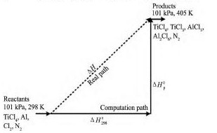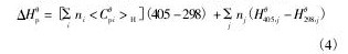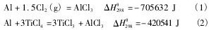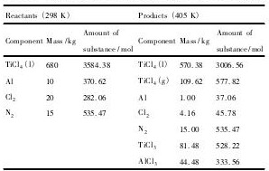 式中i为生成物种类,具体包括Ti Cl3,Al Cl3,Ti Cl4( g) ,< Cθpi>H为第i种生成物的摩尔热容,ni为第i种生成物对应的物质的量。j为未反应完全的反应物或者不参与反应的物质种类,具体包括Ti Cl4( l) ,Al,Cl2,N0; ( Hθ405,j- Hθ298,j) 为第j种未反应完全的反应物或者不参与反应的物质从298 K升温到405 K的焓变,nj为第j种类物质对应的物质的量。