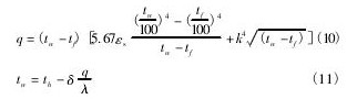式( 10,11) 中,tw为炉底部外壁温度; tf为环境温度; th为炉内工作温度; q为外表面散热热流密度;δ 为炉壁厚度; λ 为炉壁导热率; εs为外壁表面灰度系数( 热辐射系数) ,一般可取0. 8; k为外壁方向系数( 热流体方向不同的校正) ,底面为1. 63。由于上两式中只有tw和q未知,联立两式可解出。由于方程过于复杂,求解时采用迭代法,使用计算机不断把新的计算结果tw带入原式重新计算,不断逼近,当结果符合精度值时,即为最终所需结果。求得的结果tw= 398. 83 K。