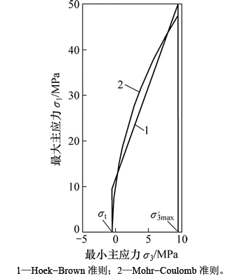 图1 Hoek-Brown准则和Mohr-Coulomb准则的最大主应力和最小主应力关系
