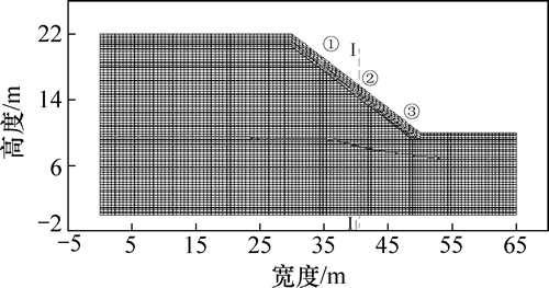 渗流边界条件:模型底部、两侧铅直位置、路面设置为不透水边界;坡面及坡脚水平面设置为单位流量边界及降雨入渗边界。