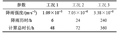 广西河池地区近50 a来的最大6 h、最大1 d、最大10 d降雨量分别为236.0,608.9和2 918.0 mm。根据该地区的降雨统计资料,本文设计了如表1所示的3种降雨工况。