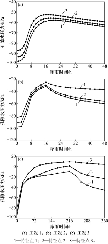 对比3种工况计算结果可知:工况1降雨时间较短,因此,特征点孔隙水压力受降雨影响幅度较小;工况2和3的各特征点变化规律基本相同;工况3由于降雨持续时间长,虽降雨强度较小,但仍对孔隙水压力产生了较大影响。由此可见:在相同情况下,短时强降雨工况对边坡体内孔隙水压力的影响比长时间且总体降雨量大的降雨工况小。