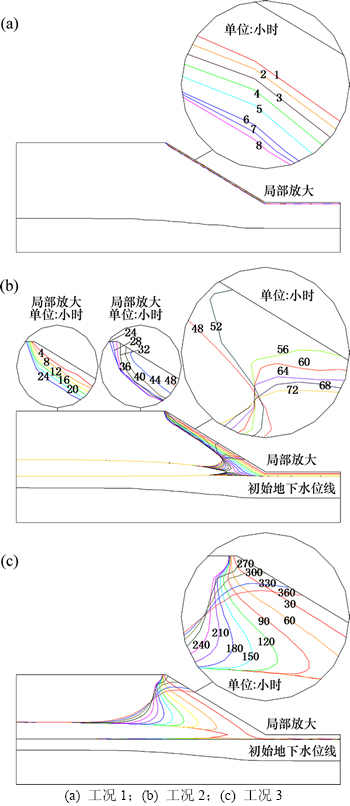 从图7(c)可知:在工况3条件下,路堤暂态饱和区在降雨240 h后已经延伸至路肩垂直向下的整个区域,并随着雨水的持续入渗向路基内部缓慢发展;降雨持续入渗30 h后,路堤暂态饱和区已经扩展至初始地下水位线,且在较短时间内导致初始地下水位线迅速上升,在降雨240 h时,地下水位线已经上升到路堤中部;降雨停止后,路堤暂态饱和区的消散具有明显的规律,由270 h时的暂态饱和区分布范围可以看出,在降雨停止后的30 h内,路堤中部的暂态饱和区仍然在往路堤中部发展,而路堤顶部的暂态饱和区则沿着坡面逐渐向下消散,直至在足够长的时间内恢复到初始状态;此外,暂态饱和区的消散过程要慢于形成过程。