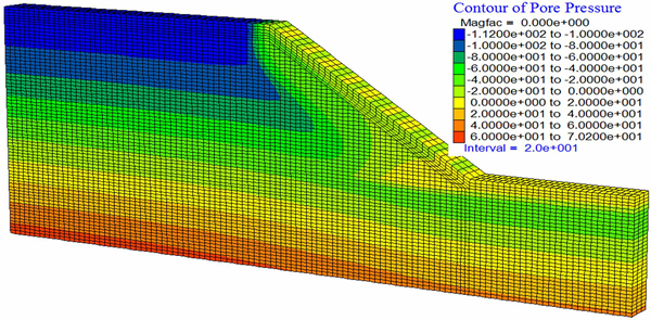图9 导入孔隙水压力后的路堤三维模型图(降雨90 h)