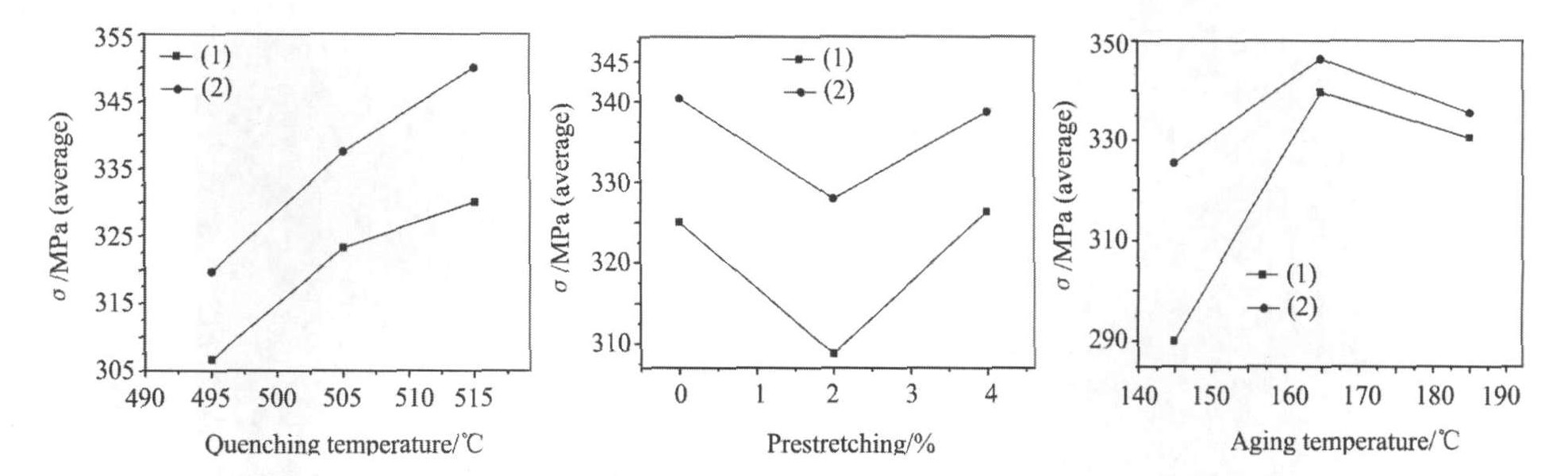 显著影响因素固溶温度、 预拉伸变形量和时效温度对合金高温屈服强度和抗拉强度的影响趋势如图1所示。
