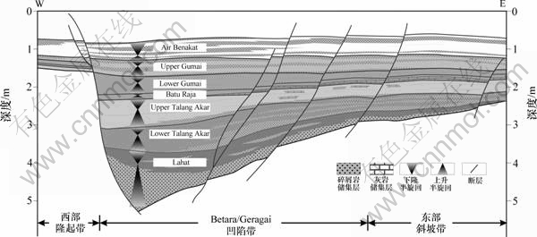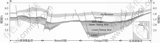 南苏门答腊盆地北部指Tigapuluh山脉东部的临海地区,位于盆地北部边缘,主要由基底构造和断陷期构造控制(图1),由西向东依次可分为4个构造带:西部隆起带、Betara 凹陷、Geragai凹陷和东部斜坡带(图2)。大量的钻井、地震、重磁等资料证明,南苏门答腊盆地分为陆上与海域 2 部分,是新生代早期印度洋板块向东南亚板块俯冲由弧后扩张形成的弧后裂谷盆地,经历了裂谷、裂谷—坳陷过渡、坳陷、盆地挤压反转这4个构造演化期[1-4],依次沉积了始新世中晚期裂谷发育阶段的Lahat组,渐新世裂谷—坳陷过渡阶段的Talang Akar组,中新世坳陷发育阶段早期的Batu Raja组、中期的Gumai组、晚期的Air Benakat组和Muara Enim组,以及上新世—更新世挤压反转阶段的Kasai组[5-10]。此次研究的目的层位为Lahat组、Talang Akar组、Batu Raja组、Gumai组和Air Benakat组(见图2)。