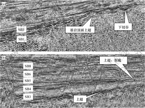 (a) 对应层序界面SB1和SB3地震反射特征;(b) 对应层序界面SB3,SB4,SB5,SB6和SB8地震反射特征