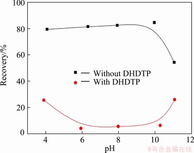 Fig. 2 Effects of pH on flotation of galena by collector DDTP (6.5 mg/L) with or without DHDTP depressant (278 mg/L)