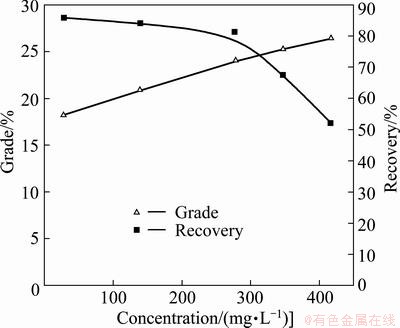 Fig. 5 Effects of concentrations of DHDTP on separation of chalcopyrite by collector DDTP (6.5 mg/L) at pH 6