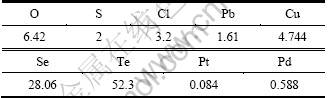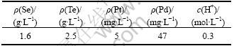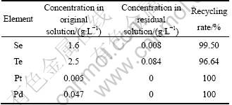 铜阳极泥是电解精炼粗铜时所产生的不溶物,它的产率一般为电解铜产量的0.2%~1.0%,因其中含有大量的贵金属和稀有元素而成为提取稀贵金属的重要原料[1]。目前,国内采用湿法流程处理铜阳极泥的工厂已达40%以上。铜阳极泥经预处理[2-4]脱铜(硒碲)之后,采用亚硫酸钠或氨水浸出银、氯酸钠浸出金工艺分别得到分银液和分金液,分银液用水合肼或甲醛还原得到银粉,分金液用亚硫酸钠或草酸还原得到金粉和沉金后液[5]。沉金后液含有大量的硒碲铂钯,目前一般在沉金后液中加入锌粉置换铂钯得到铂钯精矿,其工艺简单,操作方便;但是,锌粉置换法得到的铂钯精矿中铂钯含量低,回收铂钯时损失大,造成硒碲流失,锌粉用量大,生产成本高[6-12]。此外,有报道采用铜粉或铜片置换沉淀溶液中的硒碲,不过沉淀物中的硒和碲是以硒化铜和碲化铜的形式存在,不利于后续硒碲分离,延长了工艺流程[13-15]。本文作者采用SO2直接还原沉金后液回收硒碲和捕集铂钯[16],该处理工艺使硒和碲得到回收,所得还原产物硒碲品位高,有利于硒碲分离回收;另外,铂、钯等贵金属得到完全回收并高度富集,为含稀贵金属溶液的有效综合利用提供一条可行途径。