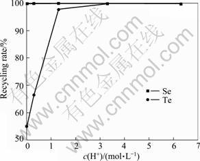 Fig.5 Effect of concentration of H+ on recycling rate of selenium and tellurium