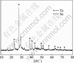 由表3可知, 硒和碲几乎全部被还原,同时铂和钯也得到完全回收,硒回收率为99.5%,碲回收率为96.64%,铂和钯回收率均达到了100%;由表4可知,还原产物中硒、碲、铂和钯的质量分数分别为28.06%、52.3%、0.084%和0.588%。由表4和5比较可知,采用SO2直接还原法得到的铂钯精矿中硒碲含量远高于采用锌粉置换法得到的铂钯精矿中硒碲含量,使硒碲得到有效富集,有利于硒碲分离回收;此外,采用锌粉置换法得到的铂钯精矿残留大量的锌粉,不利于后续硒碲铂钯的分离,而采用SO2直接还原法可以避免锌粉浪费,可降低生产成本。