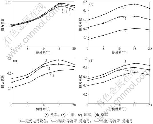 为模拟列车实际运行状态,实验中受电弓处于升弓状态。来流速度为60 m/s,并通过转动转盘使动车模型与来流方向成0°,5°,10°,15°和20°的侧滑角,得到高速列车模型在受电弓设备影响下所受阻力系数、升力系数和侧力系数,并分析其特性。