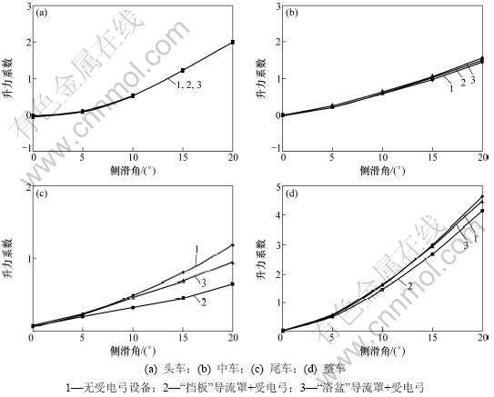 (3) 列车升力系数随着侧滑角的增加而增大,但受电弓设备仅对尾车的升力系数有影响,安装受电弓设备可以使尾车升力系数降低,“挡板”式导流罩使升力系数降低的更为明显,其缓解列车升力的效果较好。