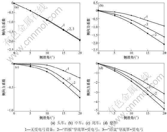 有受电弓设备与无受电弓设备相比,头车和中车升力系数随侧滑角变化曲线基本重合,即受电弓设备对头车和中车的升力系数影响较小;受电弓设备对尾车的升力系数影响较大,受电弓设备的安装可以使尾车升力系数降低,“挡板”式导流罩使升力系数降低的更为明显,当侧滑角为20°时,与无受电弓设备时升力系数相比下降了20.4%。由于受电弓设备仅对尾车升力系数影响较大,因此,其对整车升力系数的影响规律与对尾车升力系数的影响规律基本一致,即“挡板”式导流罩缓解整车升力的效果较好。