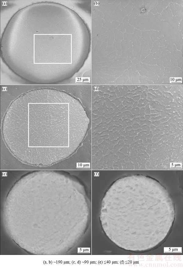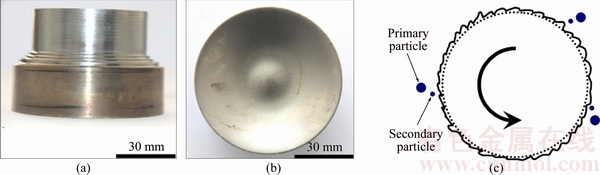 Figure 2 shows the features of the edge and surface of the TiNi anode after PREP. It can be seen that the edge and cross-section surfaces of the anode are smooth. According to CHAMPAGNE and ANGERS [19], the melt flows to the edge of anode as a consequence of the centrifugal force, forming an earring that is further disintegrated into liquid droplets, which are solidified into “primary particles”, as shown in Fig. 2(c). The large liquid droplets may be further disintegrated into smaller ones, which are solidify into the so-called “secondary particles”. Due to surface tension during rapid solidification, spherical or spheroid particles are formed [14,19-21]. The atomizing mechanisms involved in PREP include direct drop formation (DDF), ligament disintegration (LD), and film disintegration (FD) [19].